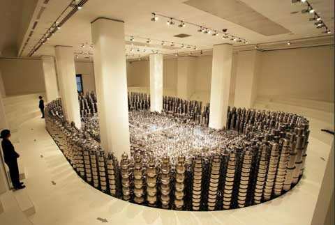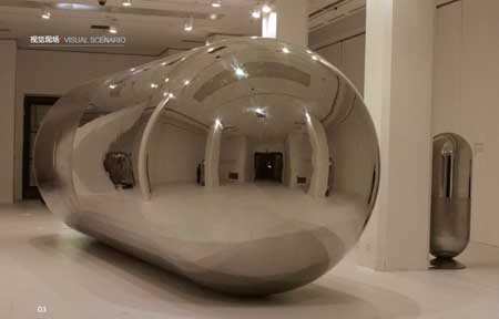 1.与传统审美的关系。他发现了传统资源可变的能量,这涉及到中国当代艺术面临的诸如此类的问题。如何理解传统?传统在今天到底有什么意义?传统如何被转换或转译(Translation)?我们从他作品中可以看到他不是把传统变成一种死的传统,而是把它看做是一个活的传统,而且是一种与当代性相联系的传统。我想最好用这样一句话说明较妥,展望的艺术在传统与现代、过去与未来、东方与西方之间进行了“再观念化”(re-conception)的处理——从1995年独立性和单体性的不锈钢假山石,到2000年前后的集合性不锈钢假山石群,都是通过这样的方法转译,从而形成了新的语言和形式。