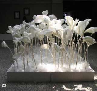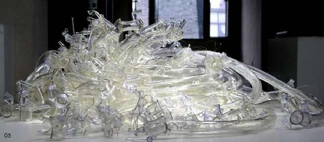 在我们今天的都市生活中,消费成为衡量大都市的一个重要指标,在全球化的环境中,跨国的消费现象借助都市的平台,根本地改变了旧有的地域性的消费习惯,越来越趋向于人工化、全球化的倾向。现代都市的消费行为返身影响着我们的日常生活,塑造着我们新的生活方式,就像汽车影响着我们对距离的理解,方便面、麦当劳影响孩子们的饮食习惯一样。我们已经不再是没有衣穿的时候买衣服,缺少某物的时候买某物,通常的情况下,我们是被消费推动着去消费,于是生活中出现了比比皆是的“购物狂”。当我们了解到我们日益依赖的生活环境中充斥着垃圾、充斥着对人体的危害,充斥着对大自然万劫不复的破坏的时候,我们更是对人类的消费现象充满了警觉,对消费之物的“误质”充满了批判的责任。60年代的总体艺术形态就以其批判的锋芒指向对于都市消费形态的审视,今天纤维与软雕塑创作更是一个伴随着思考警觉的过程,是我们接近事物之时一种批判性的方向。它们从不同的方面对今天的消费现象提出批判性的思考,以造“误”来造物。“造误”是在物自身的展示之中,揭示现代消费中的物的荒悖,揭露物的某种“误”,来唤起人们对都市消费现象的警觉,对自己日常生活异化倾向的警觉。作品《缚》呈现的是一只只包扎缠绕成型的布瓶,它们已然不再是容器,歪歪扭扭,伤痕累累,形态各异却又如此相似。是昨天,今天,还是明天?你们,我们,还是他们?同样,作品《碎片》反映了当下社会流行的“人造”面孔,越来越具有趋同的美感,它们掩饰了越来越多的真实表情,渐渐变化为漂亮的面具。以垃圾袋和废弃的边角料制作的《食》和人造《有机蔬菜》,是对今天众多非自然食物的警觉。《争· 挣· 狰》系列则以无数只痉挛的、畸形的、相互盘绕的手臂,诠释着在一个被丰盈物质充斥着的世界中,充满欲望的人们在物质化世界中的种种精神状态。《内@外.com(时裳游戏)》以反串的角色来揭示现实生活中关于着装、言行、地位、权利和身份的问题。《都市泡沫》以泡沫的真实、虚幻和消解来解读都市。同样以一次性纸巾塑造的《物品·生活·她》,隐喻着永无停歇地更换,随时可取,随时可弃。材料的选择恰到好处地应对了主题的深化。作品《缺席》以象征人类最原初生命状态的丝绵,塑造了一具具形体,人作为主体的缺席,形成一座缺乏思想的躯壳,镜子中的自我诱发人们对自己的审视和对社会的思考。《迷城&迷人》更是以废弃的、留有工业制造痕迹的印刷纸翻制成的泰迪熊,来警示人们不要习惯于成为这个世界中的一个玩偶,而是要有自己独立的思想和思考。这些作品所使用的材料大部分是消费材料本身,甚至是一次性消费材料。有的通过材料的错置来造成陌生化的效果,有的带着戏仿的方式不动声色地指出物的荒谬,它们以日常生活材料来还原日常生活本身。这些方法都极大地调动了青年学生现代消费的经验,易于开启他们的个性感受,使他们从一开始就手握生活化和批判性的两把利刃来涉入当代艺术思考。作品呈现了新一代青年对社会生活的思考,有着独特的艺术形态和鲜明的时代色彩。