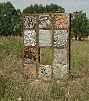 陈雷的表达总是直接而又独到,思辨型的思考方式,使他的作品具有强烈观念性的基础。他在内蒙古生活期间收集了金属残片、电力零件、碎酒瓶、吃剩的羊骨等这些日常生活的废弃物,然后像对待学校图书馆里经典书籍一样,用水泥把它们小心地封存在钢筋铁骨的陈列架上,让内蒙古的风沙见证今天的现实如何变成明天的文物。极少主义造型的金属体块,与具有奔放表现力的树根捆绑在一起,嫁接出一种莫名其妙的综合体,冷静地暗喻出人类文明与自然的对立统一关系。